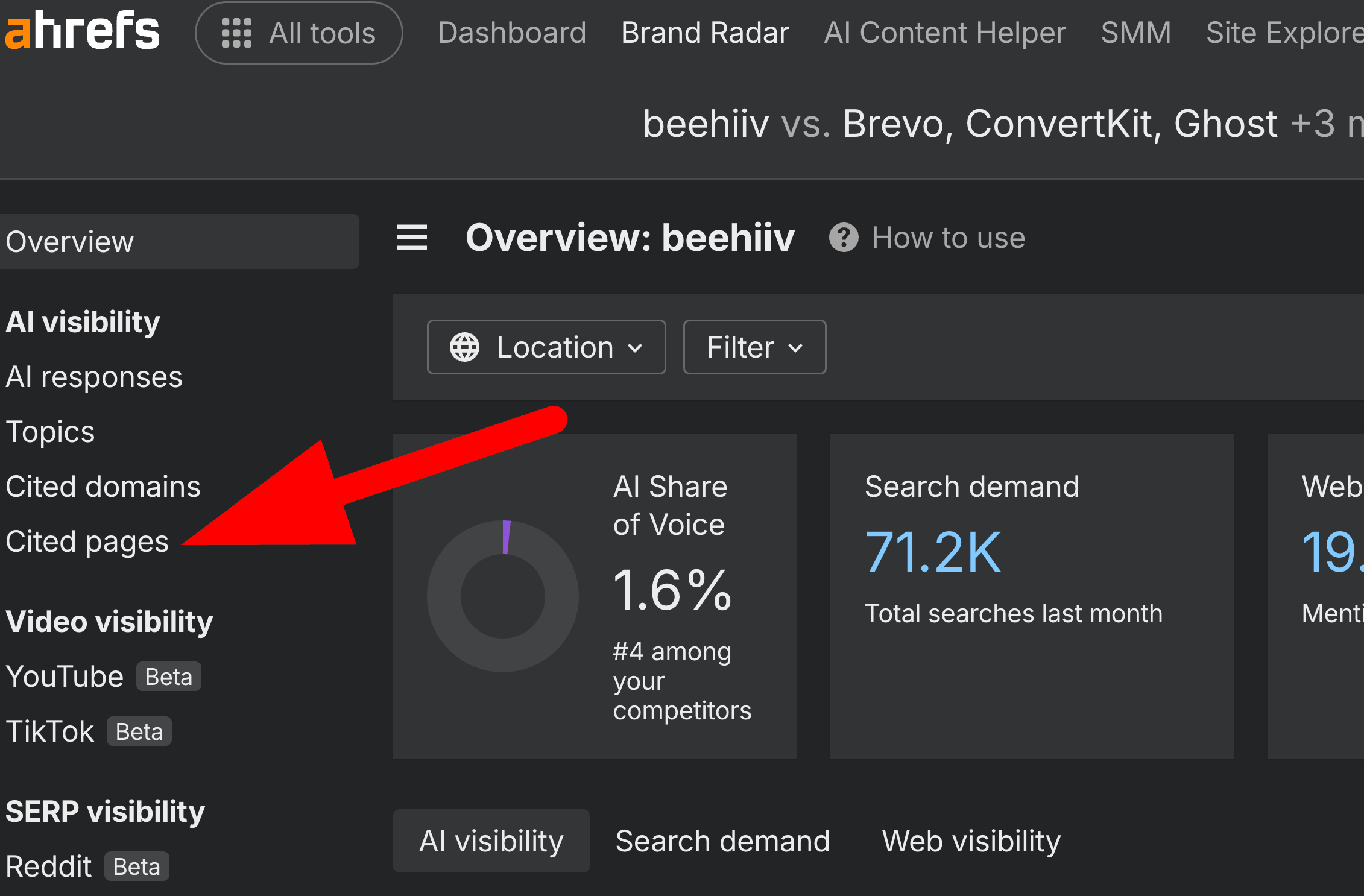 While the overview is great, we need to go deeper. Navigate to the Cited Pages section in Ahrefs.