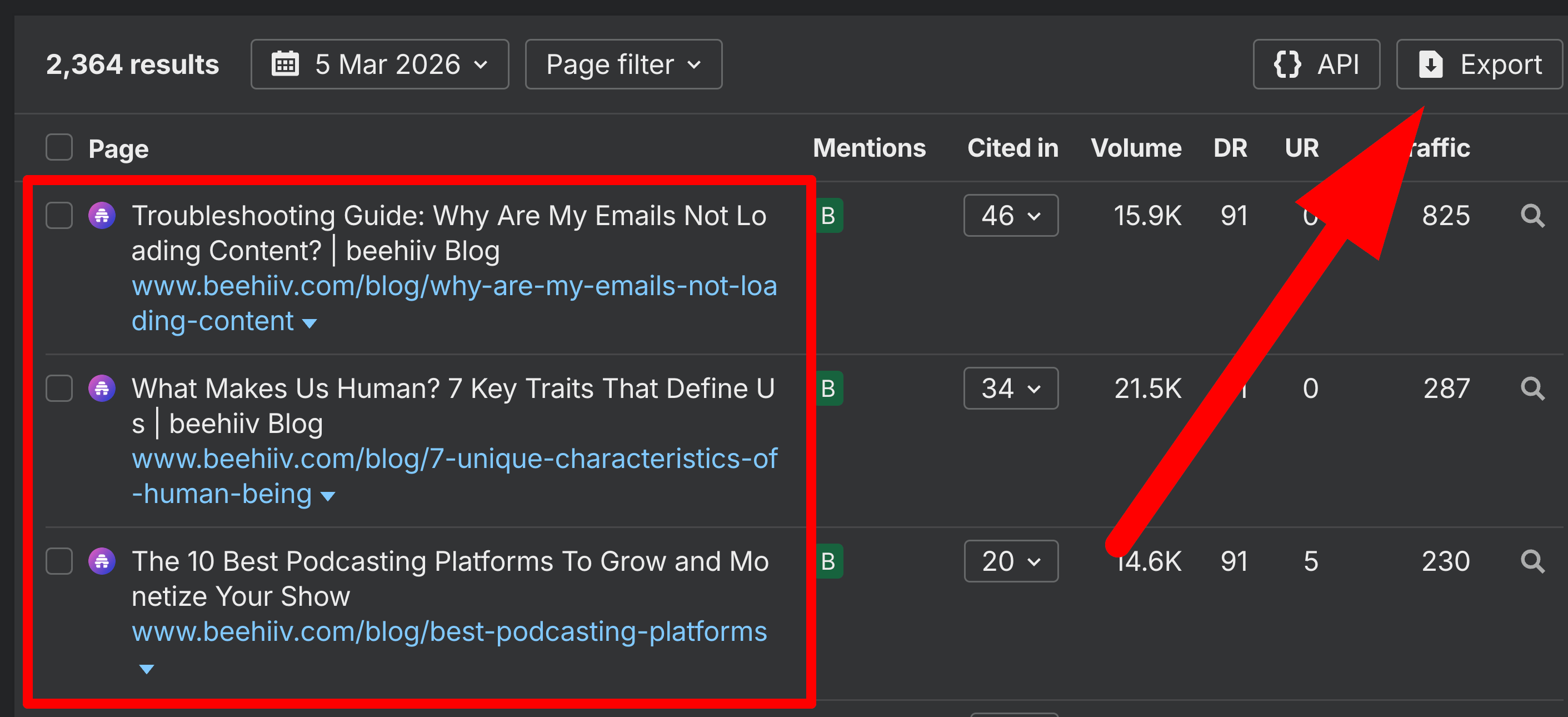 Ahrefs cited pages export