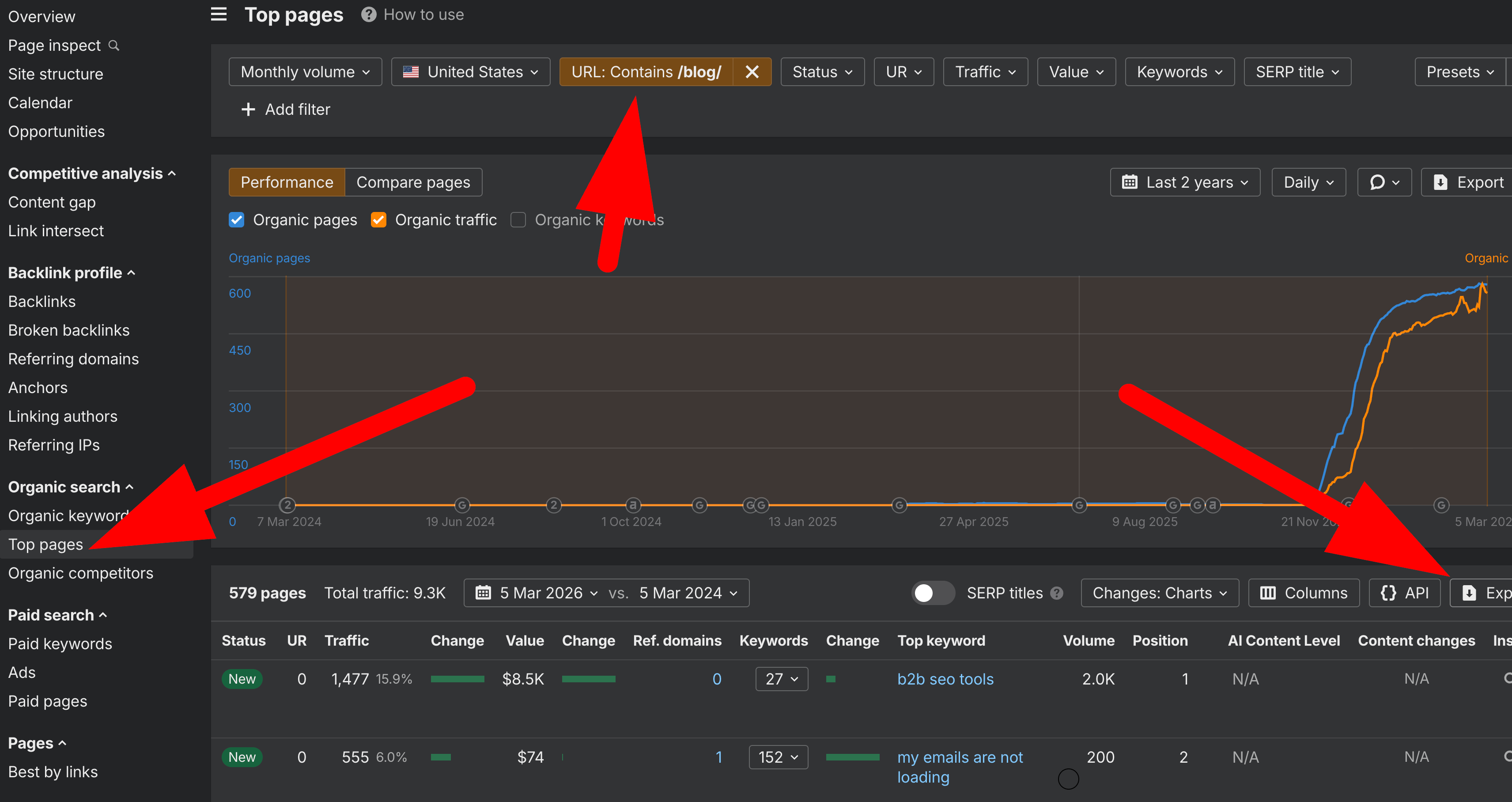 Get the top query per page from the Ahrefs “Top Pages“ report. I filtered the blog only: