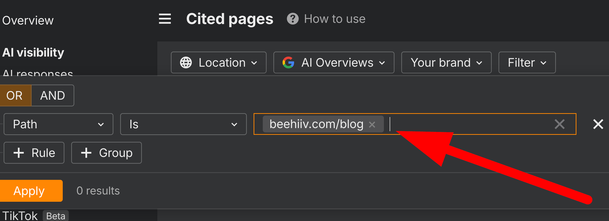 Ahrefs cited pages filter
